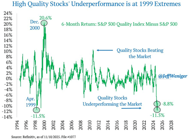 The historical parallel with the dot-com bubble can be seen in the relative performance of quality companies compared to the broader stock market.