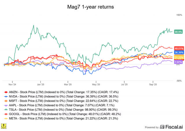This may be a surprise to some, but I’m very bullish on Amazon (AMZN). Apart from Apple, it’s the worst-performing Mag7 stock over the last year.
