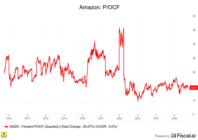 And yet, Amazon trades near the lows of its historic valuation. This is the forward P/OCF (price/operational cash flow, which has historically been a good way to value retailers, including Amazon).