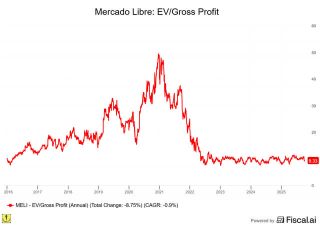 With a company that grew its revenue by 34% in the previous quarter and expected to have 35%+ revenue growth in the next two, it’s not a stretch to argue that Mercado Libre is still in high-growth mode. So, let’s first look at EV/gross profit. This is the chart.