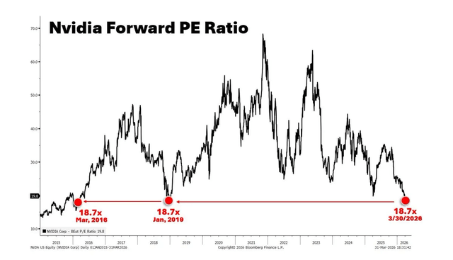 Quietly, Nvidia seems to have become very cheap again, at just 18.7x forward earnings, a multiple it has not traded at since 2018. That’s crazy, if you know that the stock is up 60% over the last year and 1,170% over the last 5 years.