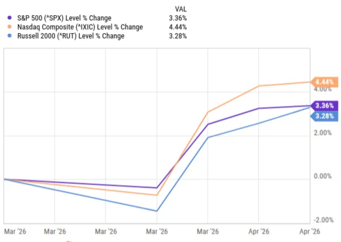 This week, the markets were up substantially. The Nasdaq won 4.44%, the S&P 500 3.36% and the Russell 2000 3.28%.