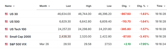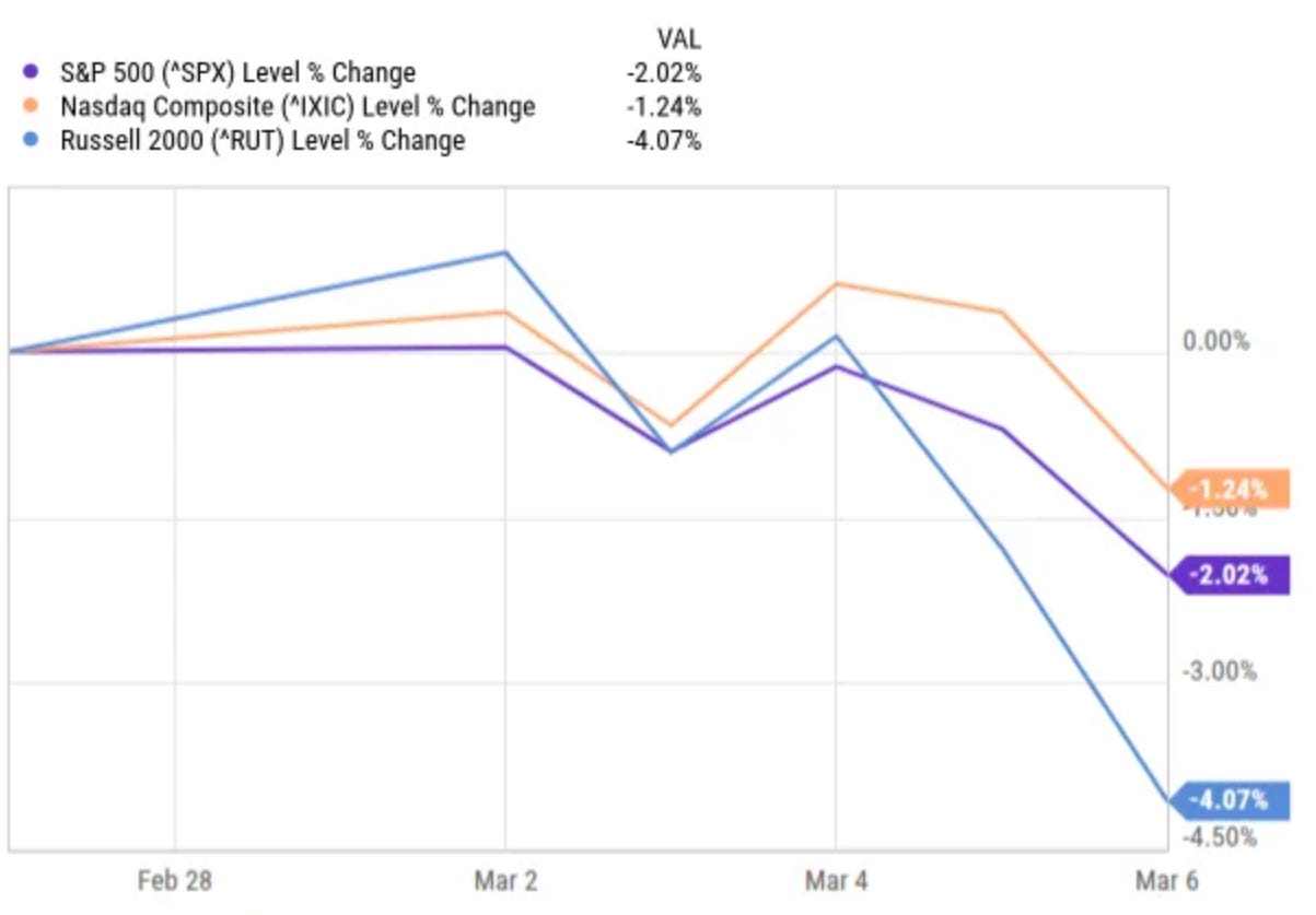 As you can see, the Russell 2000 dropped the most, by a whopping 4.07%. The S&P dropped 2.02% and, surprisingly, the Nasdaq dropped the least of the three, but it was still down 1.24%.