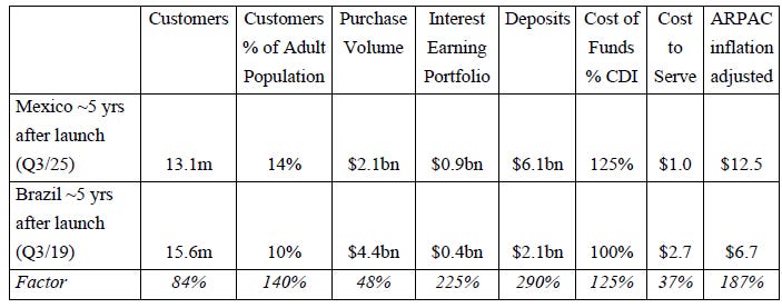 This week, I found this table, which compares Nu Holdings (NU) after 5 years in Brazil and 5 years in Mexico.