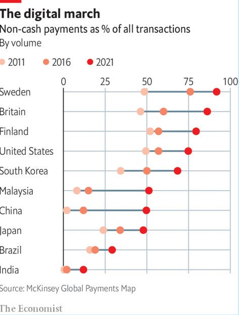 Starting a few years ago, the disruption has formed a hockey stick chart, with the increasing use of cash alternatives. This chart shows the fast growth of non-cash payments worldwide.