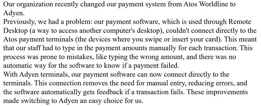 Before Adyen, it was very complex for companies to interconnect the different payment systems and methods. Adyen unified them all on its platform. For companies, even big companies like Netflix, Spotify and McDonald, Dunkin, and Nike (more customers of Adyen), these integrations are too complex and too low of a cost to take in-house.