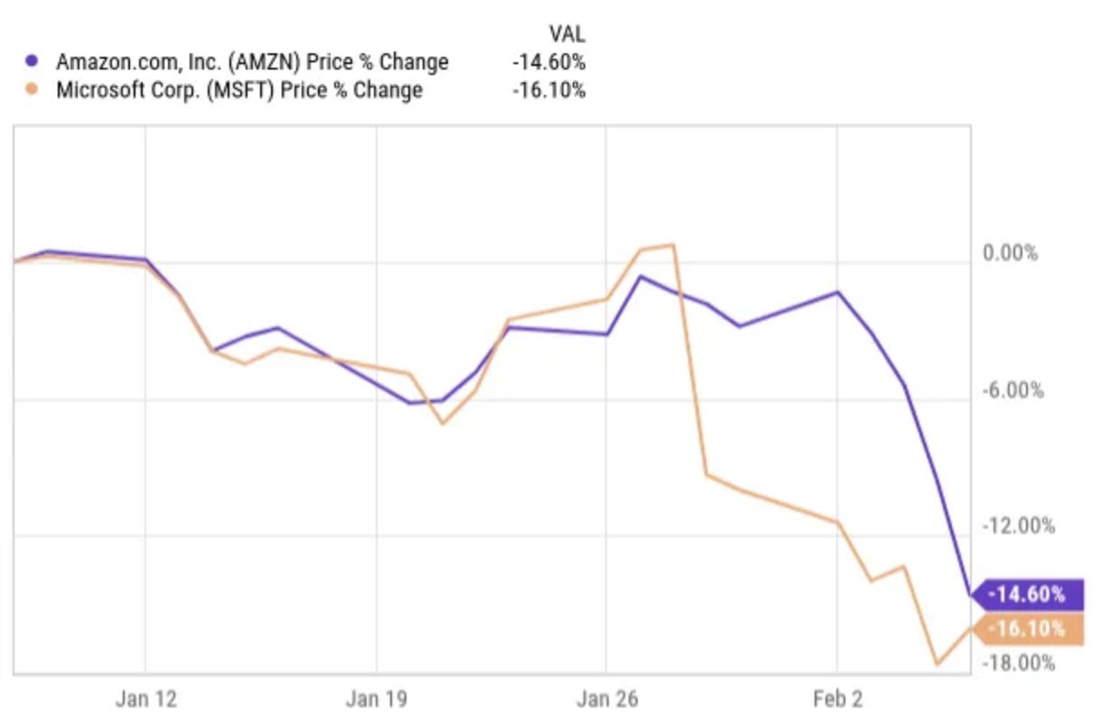 You saw a consistent pattern in Big Tech's earnings so far. The earnings were good to very good, but investors still sold the stock because of the high Capex plans. This is the chart for Microsoft and Amazon over the last month.