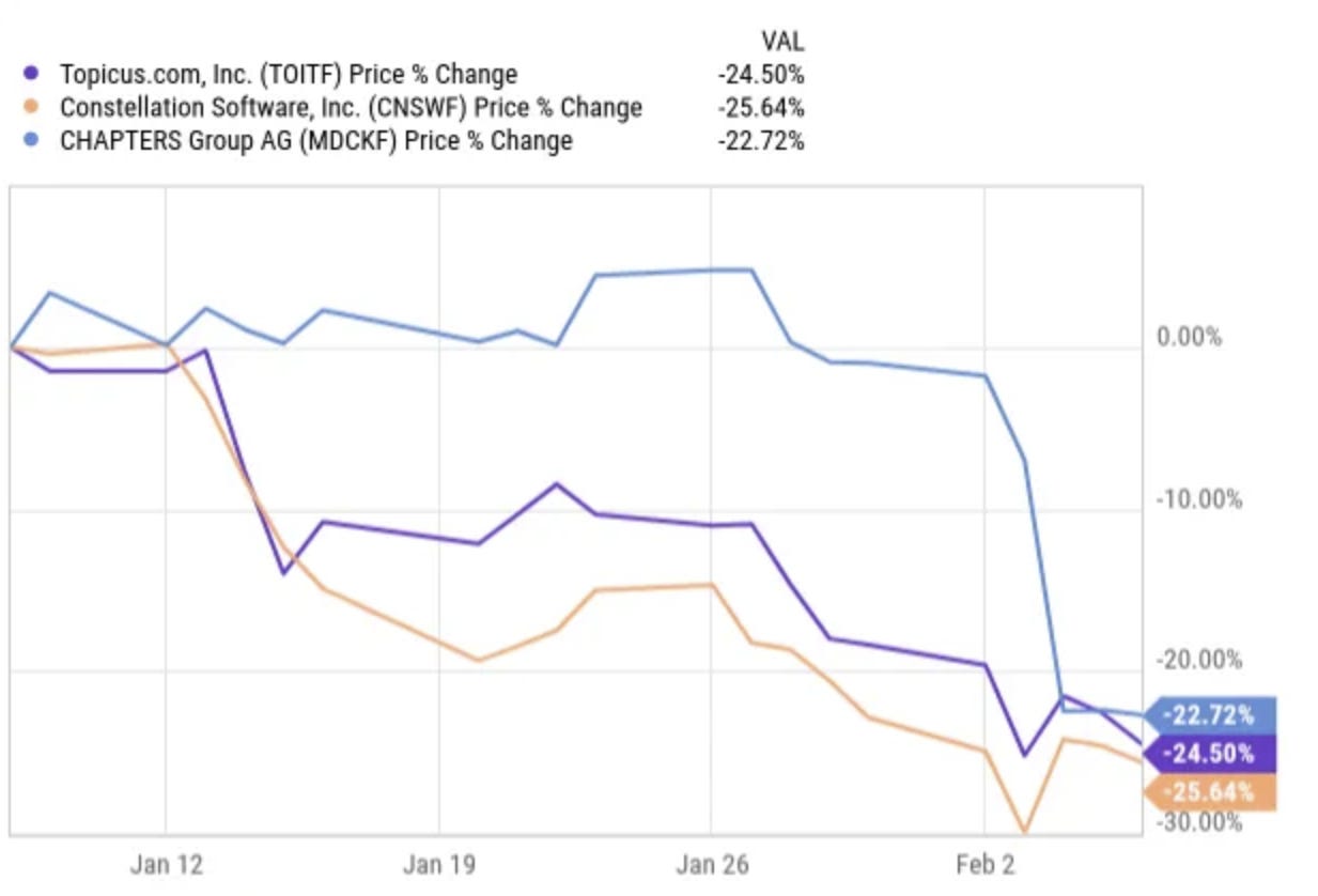This week was another dark week for VMS companies. Just look at the drops in the last month alone. Constellation Software, Topicus and Chapters Group all lost about a quarter of their market cap.