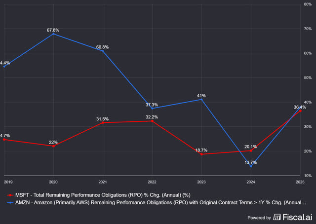 If you look at RPO, though, you see that Azure also accelerates. RPO is the abbreviation for Remaining Performance Obligation. It’s the amount that is already contracted but cannot be recognized as revenue because the services have not been delivered yet.