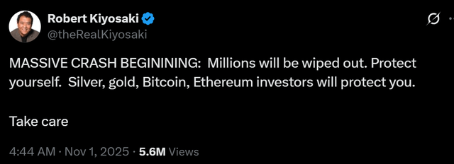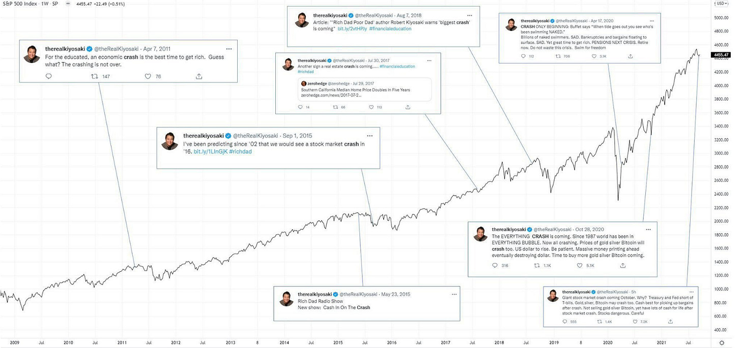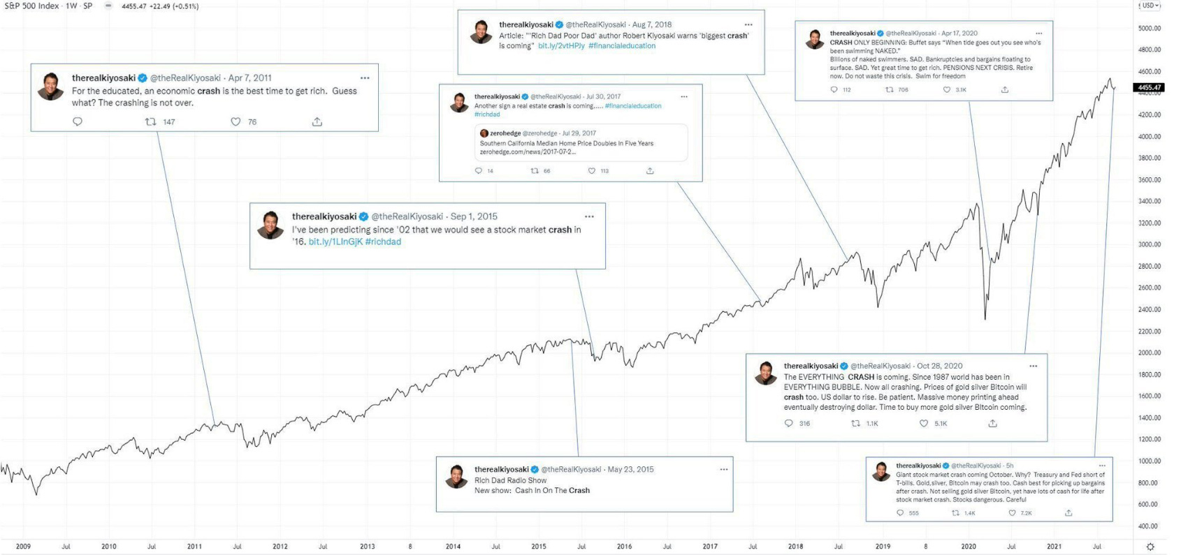 I’m not sure if you can read everything. But the chart is simple. It’s the S&P 500 and each time Robert Kiyosaki posted that there would be a huge crash. This chart is from a blog called A Wealth Of Common Sense by Ben Carlson. Carlson writes: