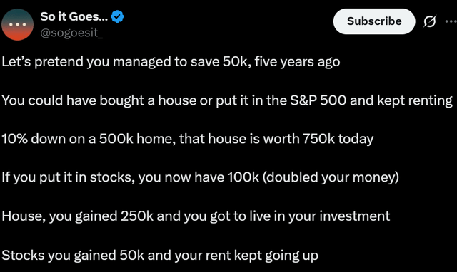 Some say that you shouldn’t buy a house to invest the money in the stock market. Renters made victory laps.