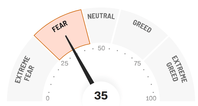 The Greed & Fear Index remained in Fear territory, but inched up a bit again, from 33 to 35.