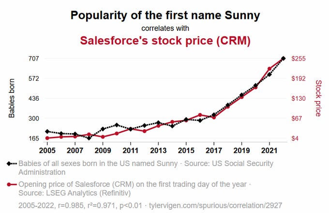 Do you really believe that the stock price of Salesforce is caused by the babies given the name Sunny? Of course not.