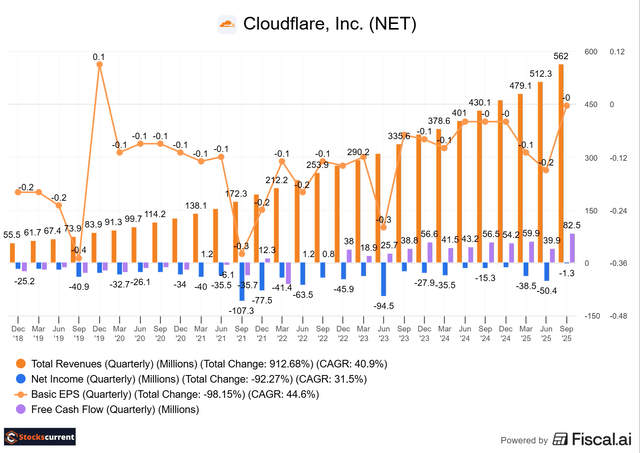 Cloudflare’s GAAP net loss was $1.3 million, compared to a loss of $15.3 million. The losses are decreasing and are close to being in profit. GAAP net loss per share was $0 (breakeven), compared to $0.04 in the third quarter of 2024.