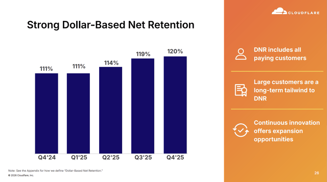 That DBNRR bounce-back is worth looking at. If you’ve followed Cloudflare over the last two years, you know this metric dropped to 110% at its trough. Management kept repeating that it was not the best metric to look at, as there was downward pressure from the pool of funds system. Now those pools are being consumed, and DBNRR has returned to 120%. That’s a very strong for a company at this scale.
