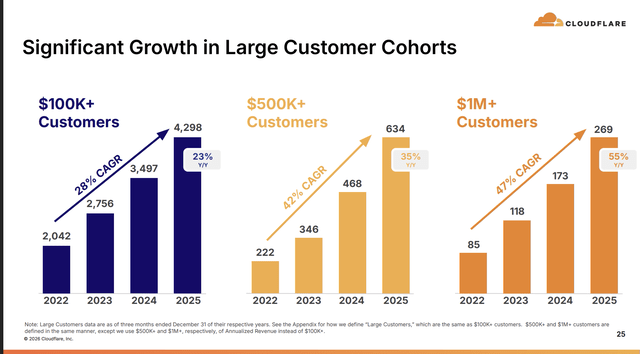 The acceleration at the top end is key here. The bigger the customer, the faster the growth. $1M+ customers grew 55% year-over-year, from 173 to 269. That’s a 47% CAGR since 2022. This is the proof that Cloudflare is successfully moving upmarket while not ignoring its self-serve public that has brought the company so much data and feedback over the years.