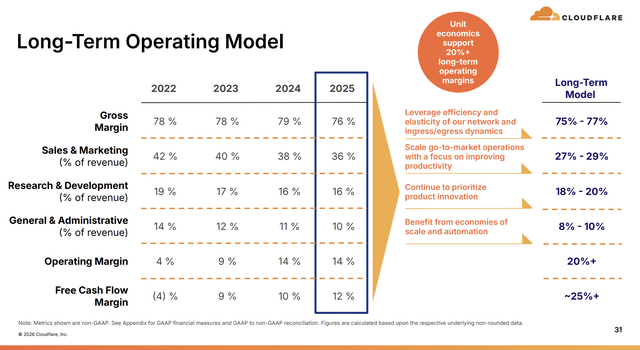 One thing I want to flag because I think it’s underappreciated: the long-term margin trajectory. Cloudflare’s (non-GAAP) operating margin went from 4% in 2022 to 14% in 2025. Free cash flow margin went from negative 4% to 12% over the same period. Those are big moves. But the long-term targets management laid out show there’s still a long way to go: 20%+ operating margins and roughly 25%+ free cash flow margins.