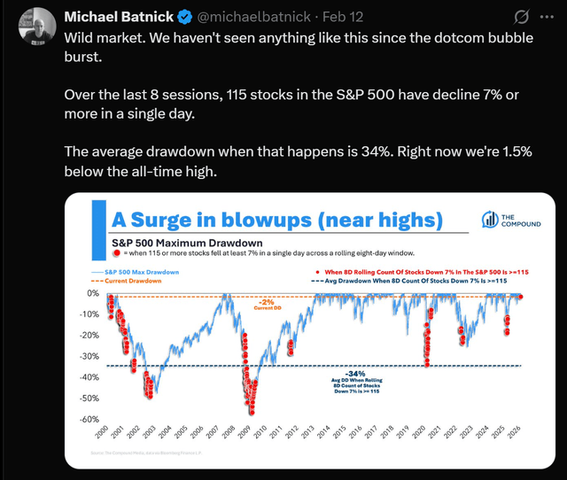 It’s the first time since the dotcom bubble that the indexes are so close to all-time highs and there’s a red dot, meaning 115+ stocks that declined 7%+ on a single day.