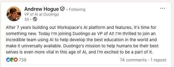 Duolingo was one of the first companies to partner with OpenAI and it is one of the biggest users of tokens from that company, but it’s still good to see a VP for AI.