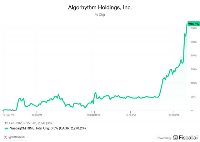 Algorhythm Holdings (RIME), which I’m sure nobody had heard of before this week, is a microcap. Before this week, it traded on a market cap of $5.8 million. It was involved in, of all things, karaoke machine imports.