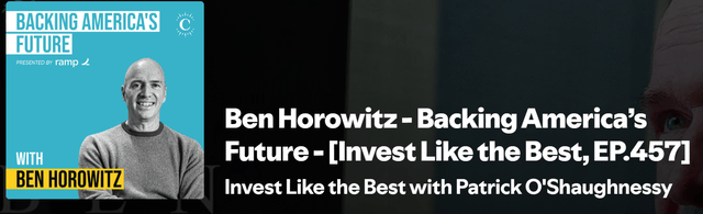 This week, I listened to Ben Horowitz, the co-founder of Andreessen Horowitz, also known as a16z. He was in Patrick O’Shaughnessy’s outstanding podcast Invest Like The Best. I liked the open and wide-ranging conversation.
