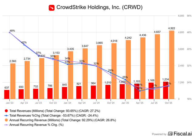 Net New ARR: Came in at $265.3 million, an impressive 73% year-over-year growth, which signals clear sales acceleration. Of course, that also has to do with the rebates CrowdStrike gave last year for the big outage.