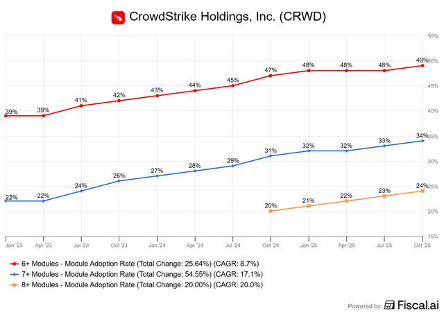 When customers use more products, it increases “stickiness” (higher switching costs) and facilitates vendor consolidation, allowing CrowdStrike to capture more market share.