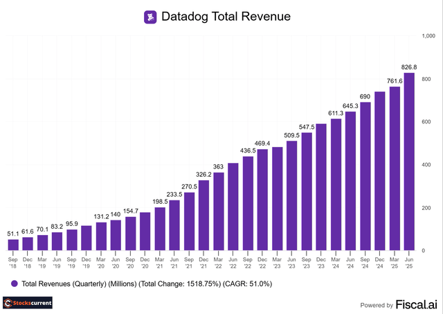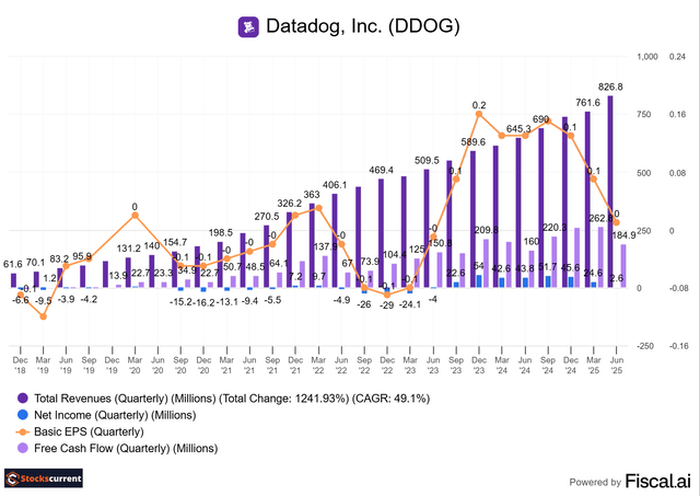 Datadog reported total revenue of $827 million, an increase of 28% year-over-year. The company's eight-year revenue CAGR of 51.02% (see the bottom of this chart) shows how strongly it has delivered.