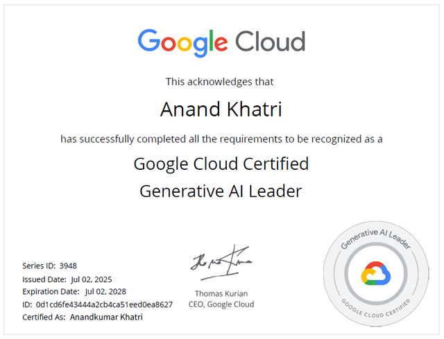 I just wanted to share a big milestone with you all: I've officially earned the Google Cloud Generative AI Leader certification!