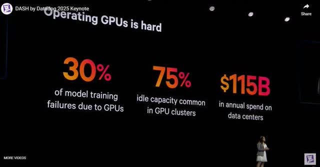 GPUs are expensive, operating a GPU is hard, and if it sits idle, it's losing money. Datadog launched the most-awaited product. "GPU monitoring" at the DASH conference this year. According to Datadog, 30% of model training failures are due to GPUs. There's 75% idle capacity in the Cluster, and $115 billion annual spending is increasing. It will be super helpful and save a lot of money for its customers.