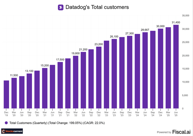 Datadog ended Q2 2025 with about 31,400 total customers, up about 9.4% from about 28,700 a year ago. This includes the 150 new customers from Eppo and Metaplane acquisitions.