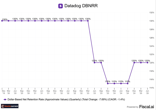The dollar-based net retention rate remains steady at 120%, a positive indicator; expansion into existing customers seems to be at a normalized level.