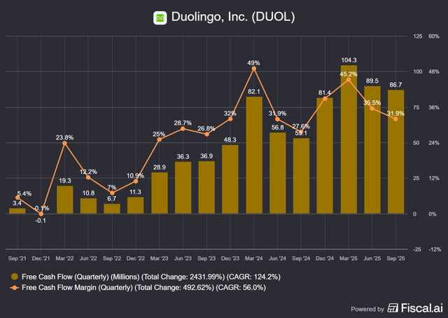 The company has generated positive free cash flow for almost three years with rising margins. For a high-growth company, consistently retaining more than 30 percent of its cash every quarter is impressive, as having more cash allows for continued resilience and optionality.