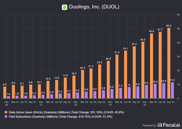 Daily Active Users are the most important metric because DAUs show real engagement and retention. DAU growth dropped from 39.9% in the previous quarter to 35.8% in this one, which is acceptable. For the first time ever, Duolingo surpassed 50 million DAUs.