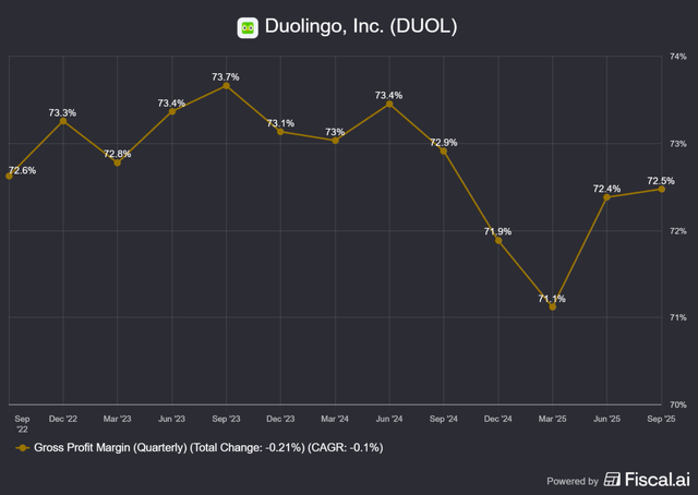 Gross Margin: 72.5%, roughly flat YoY and QoQ
