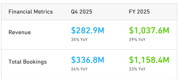 Q4 revenue: $282.9M, +35% YoY, beating estimates by $7M.