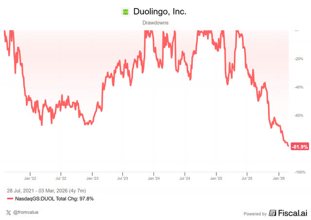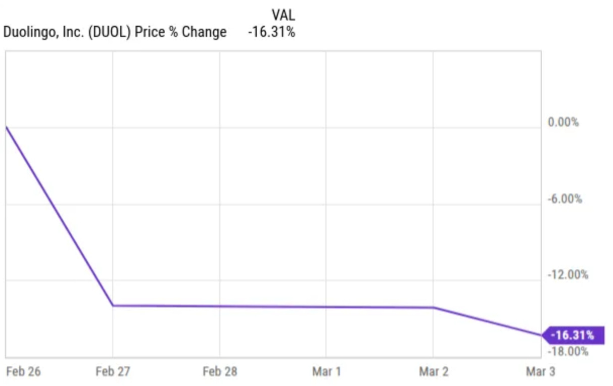 And the Q4 results on February 26 added another drop to what was already a painful crash. The stock was down 20% in the after-hours, but recovered a bit. But with the general market, Duolingo’s stock keeps falling as well.