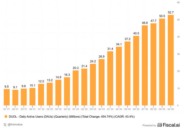 But no blaming the macro situation here. It’s a deliberate choice. CEO Luis von Ahn is deliberately sacrificing near-term profits to have 100 million daily active users by 2028. That would be a near-doubling from the current 52.7 million. His strategy is simple: grow the user base now, monetize it later.