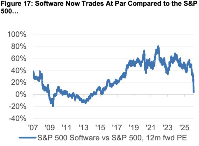 As you can see, software now trades at the valuation of the S&P 500, based on the 12-month forward PE. That’s for the first time since 2015.