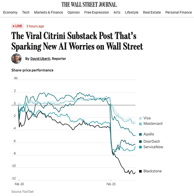 Last week, I commented on the ultrabearish Citrini science fiction story. The stocks mentioned in the article dropped quite a bit.