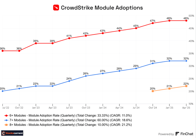 In Q1, CrowdStrike customers who adopted 6 or more modules grew to 48% from 44% a year ago, 7 or more modules grew to 32% from 28% a year ago, and 8 or more modules grew to 22%.