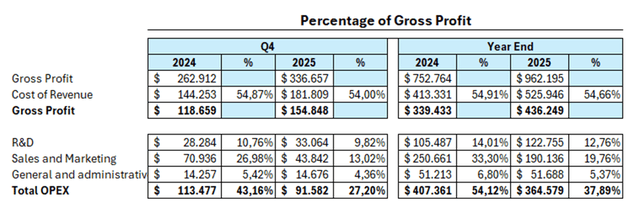 The table below presents these costs as a percentage of gross profit. The left side compares Q4 2024 with Q4 2025, while the right side compares full-year 2024 with full-year 2025.