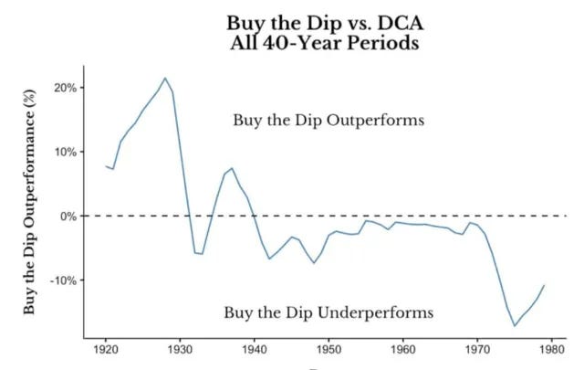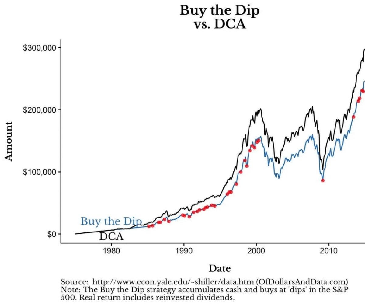 It may sound counterintuitive but buying the dip perfectly (which nobody can) underperforms dollar-cost averaging.