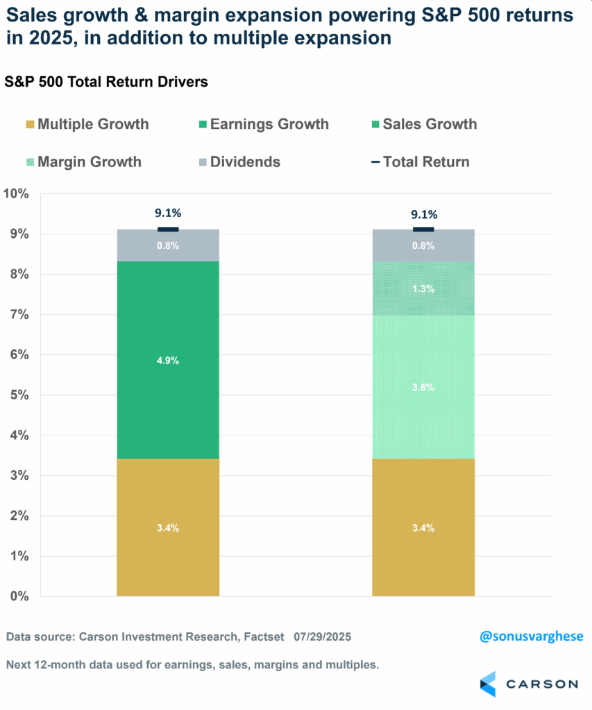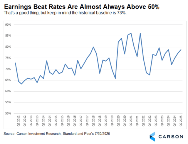 These results don’t signal a blockbuster quarter, but they do show steady strength. High beat rates are the norm, in part because companies often lower expectations just before earnings season. This quarter, only 52% of companies gave negative guidance ahead of time, slightly below the five-year average. That may reflect earlier caution from firms due to tariff uncertainty, much of which now looks priced in.