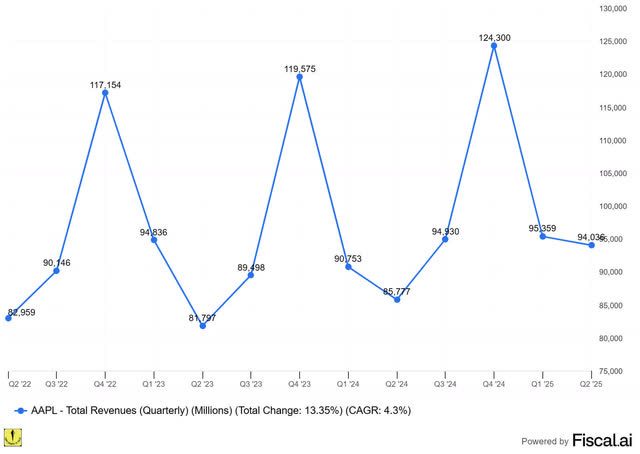 Apple delivered a decent quarter. Finally, revenue's up, although it was versus easy comps. Apple's revenue growth over the last three years? 4.3% per year. Yawn.