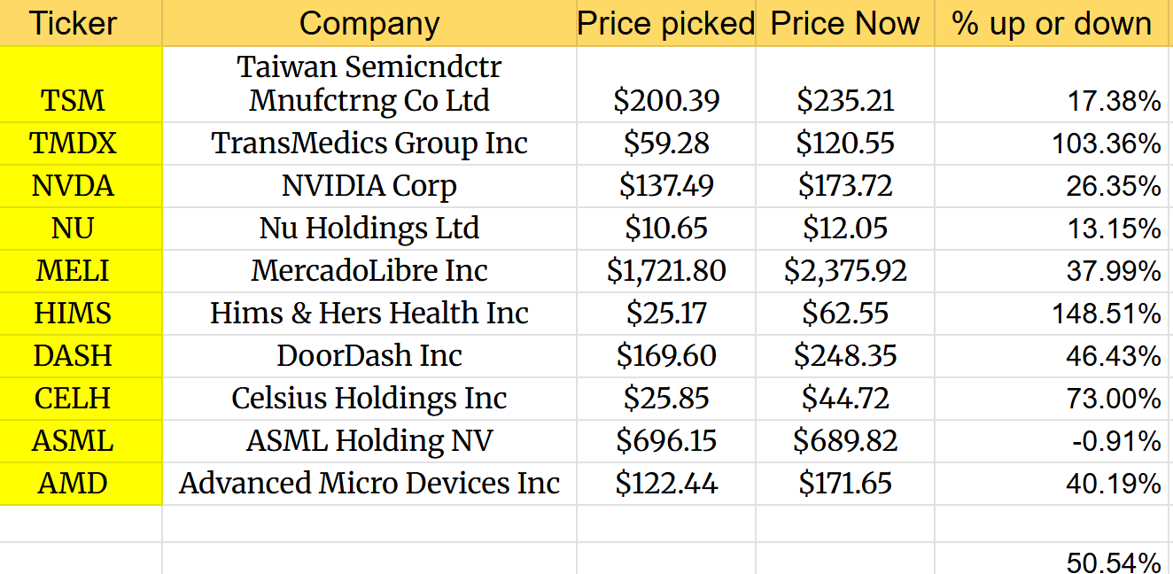 As you can see, the S&P 500 is up 6.06%. The Nasdaq is up 6.94%. How are our 10 picks doing?