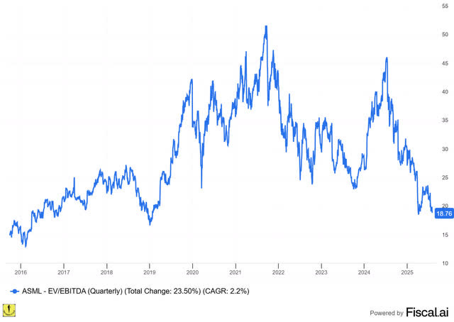 There's just one stock that underperforms the indexes, ASML. And I'm pretty bullish about that stock. The EV/EBITDA of just 18.76 shows that it's at a level not seen since 2019.