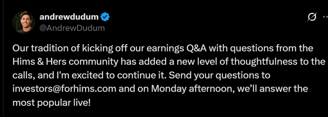 Hims & Hers (HIMS) founder and CEO Andrew Dudum wrote this on X.