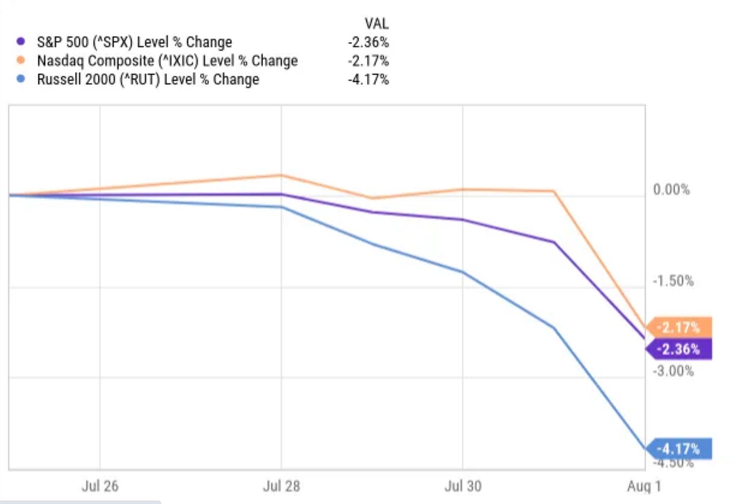 The Russell 2000 was down the most, 4.17%, the Nasdaq 2.38% and the S&P 500 2.17%.