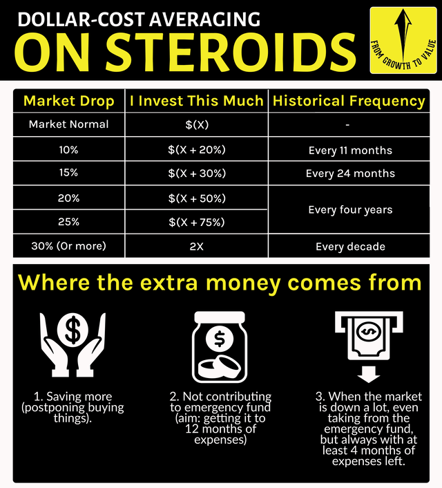 Only when markets drop substantially, I add more through my system of Dollar-Cost Averaging On Steroids system. This is how it works.